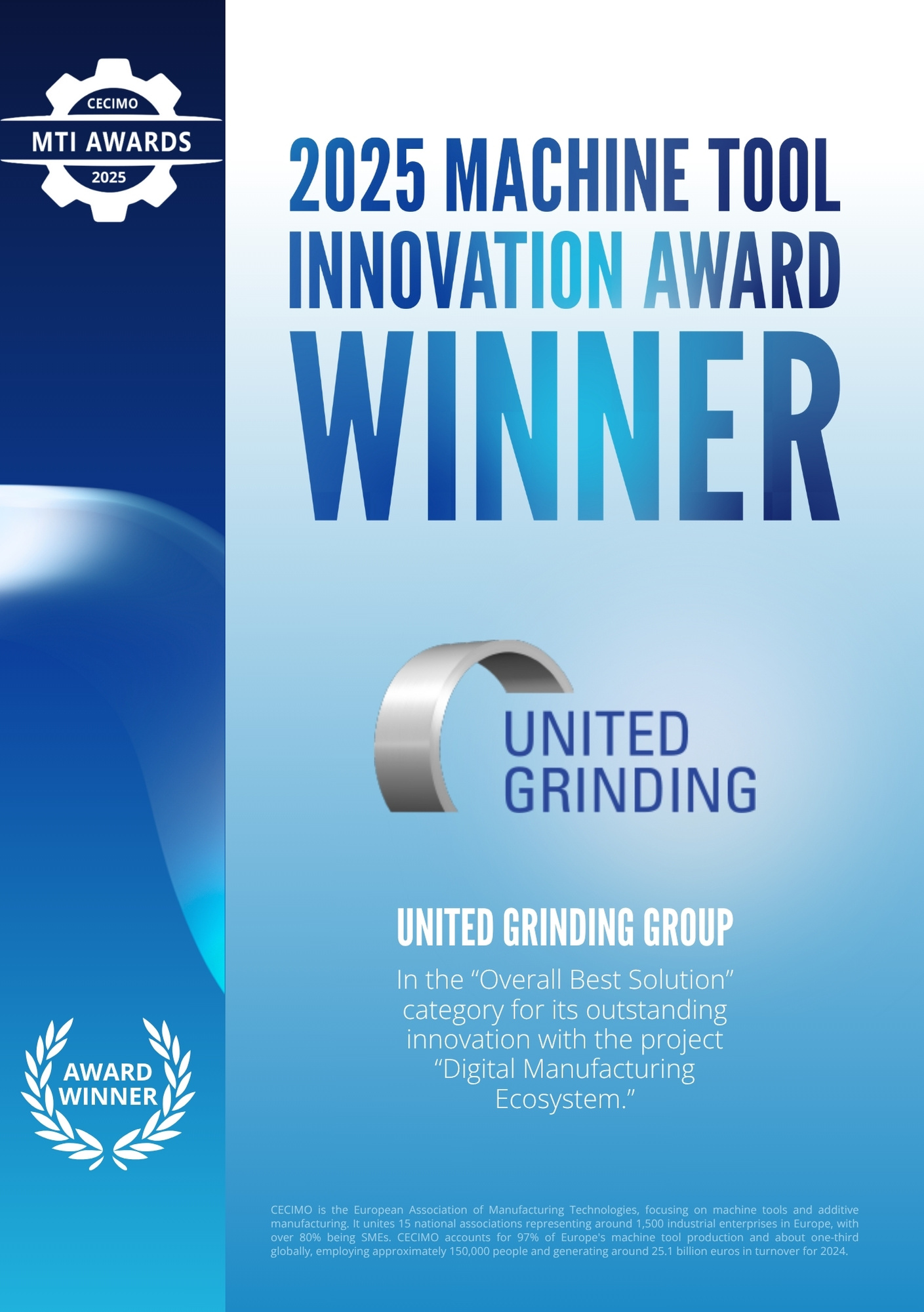 UNITED MACHINING SOLUTIONS se félicite d’un succès phénoménal lors des Machine Tool Innovation (MTI) Awards 2025, organisés par l’Association européenne de l’industrie des machines-outils (CECIMO). Le groupe a impressionné le jury à deux reprises : UNITED GRINDING a remporté le prix principal, Best Overall Solution, pour son concept révolutionnaire de “Digital Manufacturing Ecosystem”, tandis que CHARMILLES a reçu le Green Impact Award pour son projet durable et innovant “Precision Redefined with 3D Shaping & LASER S 500 U.” Les deux distinctions ont été remises pendant EMO Hannover 2025, le plus grand salon mondial des machines-outils et des technologies de fabrication – marquant un double triomphe pour le groupe nouvellement formé et soulignant sa force d’innovation.